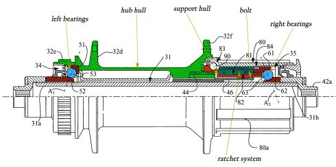 滾珠(珠檔)花鼓是由碗,軸檔和中間緊密排列的滾珠構(gòu)成的(中間留有細(xì)小的活動(dòng)間隙),它們和花鼓體一起構(gòu)成一個(gè)大軸承,由于滾珠之間不需要像工業(yè)軸承那樣使用保持架,因此同樣尺寸的滾珠(珠檔)花鼓可以容納更多的滾珠,而且每顆滾珠的接觸面積較大,可以承受更大的壓力。
